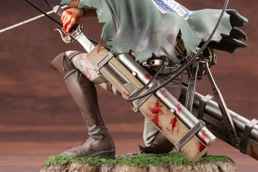 Společnost Kotobukiya přináší do své série figurek ArtFXJ nádherné nové figurky v měřítku 1:7 ze série mangy a anime Attack on Titan (Útok titánů). V dynamické póze, jako vytržené z boje se zde představí Levi. Jedna z hlavních postav je zachycena do každičkého detailu včetně jeho znuděného výrazu a očí, ze kterých číší naprostý klid zkušeného bojovníka. Figurka je modelována na mechem pokryté zemi.