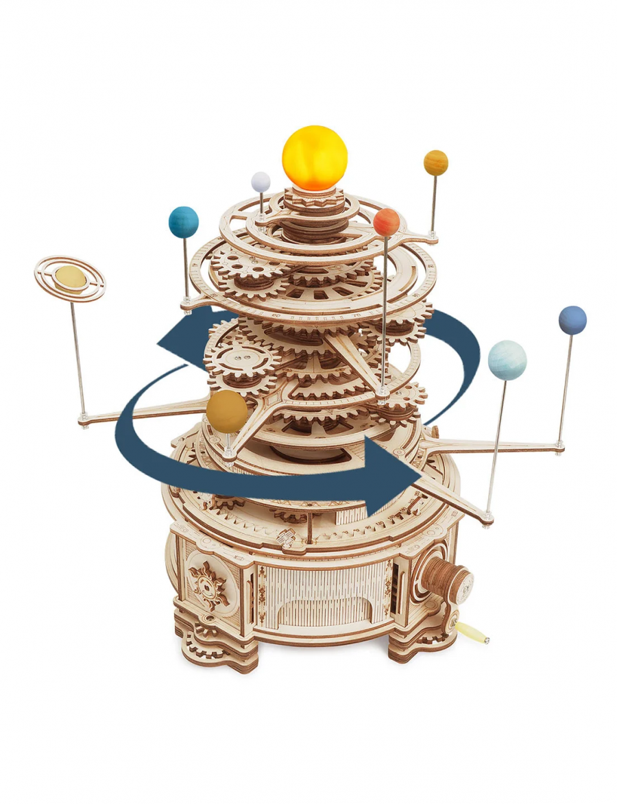 Tento mechanický orloj je 3D dřevěná skládačka znázorňující oběžnou dráhu 8 planet sluneční soustavy. Jedná se o zábavnou a vzdělávací puzzle hračku, která rozvíjí zvědavost a tvořivost i získávání znalostí. K jehož složení nebude zapotřebí lepidlo, ale jen čas a trpělivost. Součástí balení je podrobný anglický návod. Vhodné pro malé i velké stavitele.