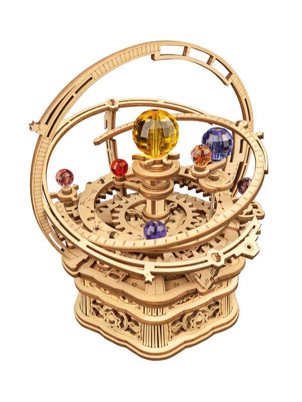 Kouzlo hvězdné oblohy zachycené v pohybu. Dřevěná stavebnice Starry Night vás vtáhne do světa ozubených kol, drahokamově zářících planet a elegantních orbit, které se po sestavení roztančí v harmonickém rytmu.