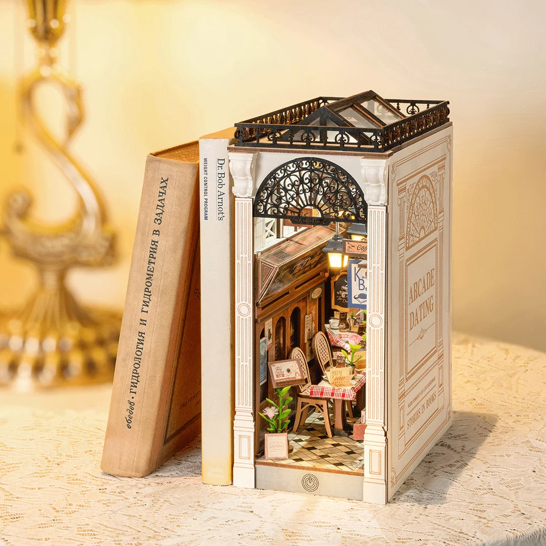 Romantická atmosféra pařížské kavárny ukrytá mezi vašimi knihami. Dřevěná stavebnice Arcade Dating promění obyčejnou poličku v okouzlující uličku s kavárnou, lampou a drobnými detaily, které vytvářejí jedinečný příběh.