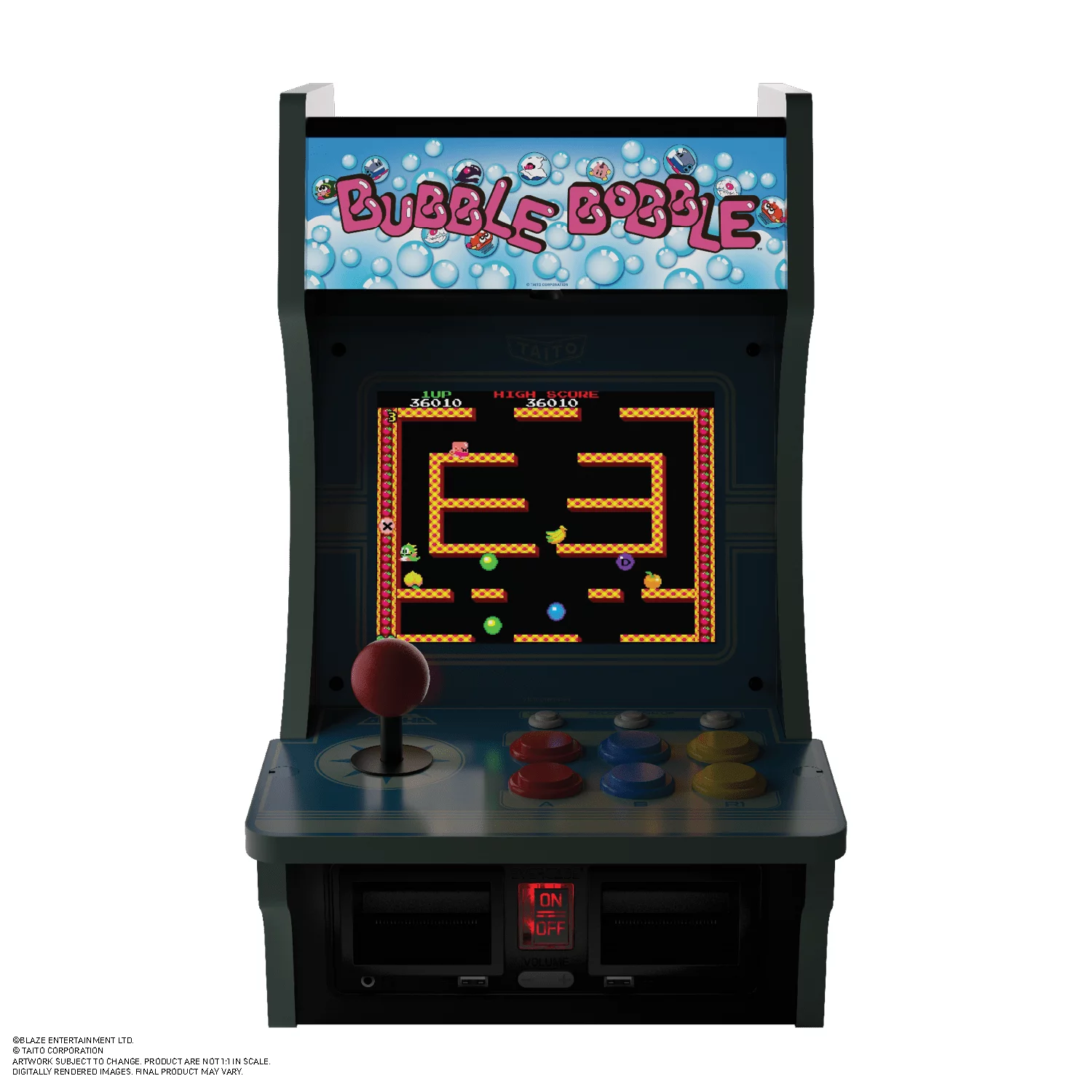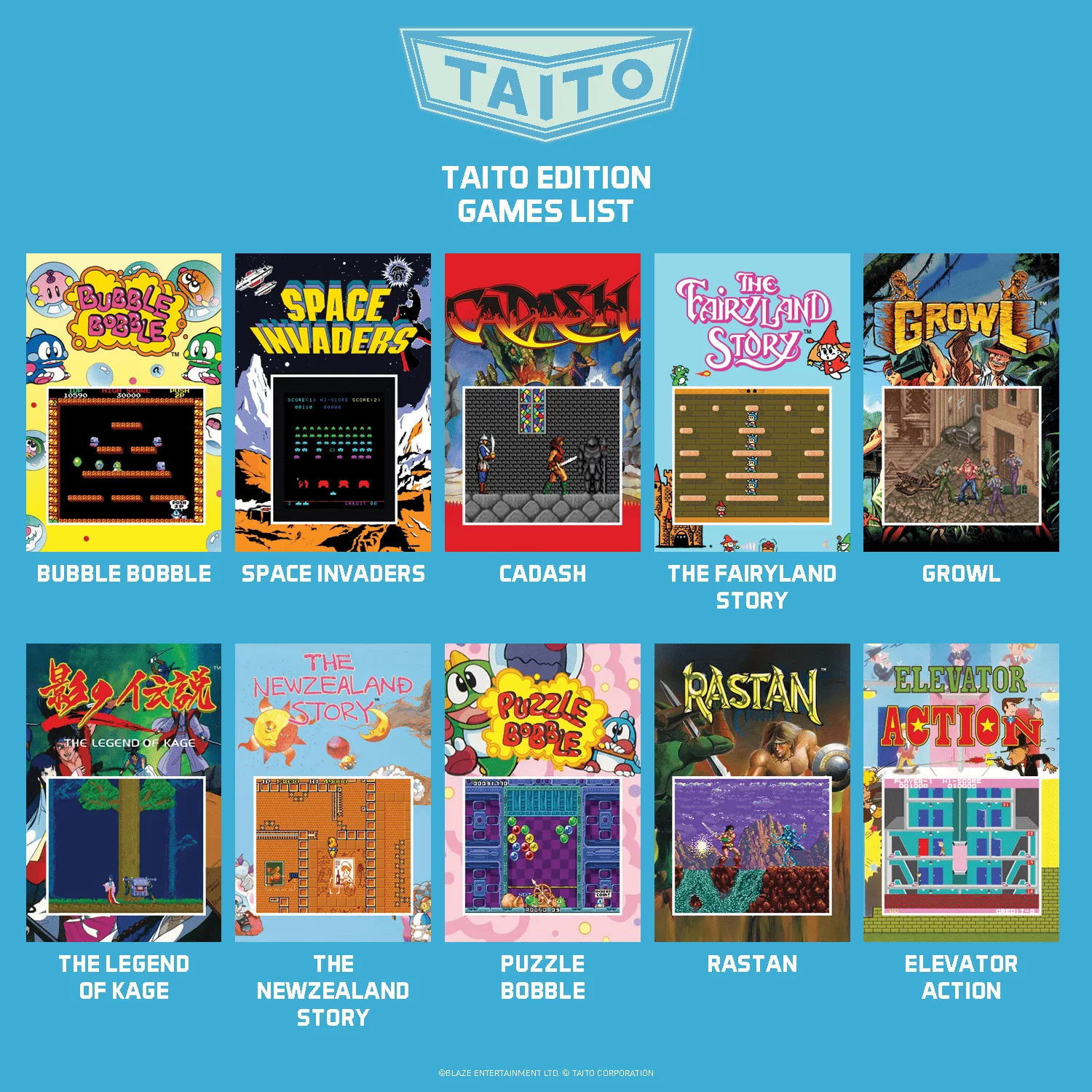 Evercade Alpha Bartop Arcade Taito Edition vám přináší 10 klasických her od Taito s autentickým soutěžním arkádovým ovládáním, jasnou 8" obrazovkou a zabudovanými stereo reproduktory. Přizpůsobte si Evercade Alpha pomocí výměny podsvícených panelů díky tematické grafice Bubble Bobble, Space Invaders a Rastan. Hrajte s kamarádem díky dvojitému portu USB a podpoře ovladačů kompatibilních s Evercade. Součástí jsou předem nahrané hry Bubble Bobble, Space Invaders, Rastan, Puzzle Bobble, Cadash, Elevator Action, The Fairyland Story, Growl, The Legend of Kage a The NewZealand Story. Obohaťe si Alpha díky kompletní kompatibilitě se systémem cartrige Evercade, která vám zpřístupní více než 500 her na více než 60 cartrige.SEZNAM HER