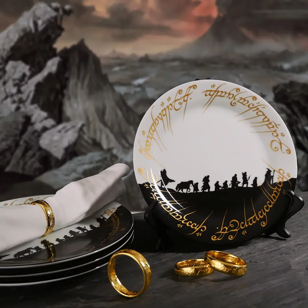 Sada 4 talířů v barvách Společenstva prstenu. Součástí jsou také 4 kroužky na ubrousky s motivem Jednoho prstenu.