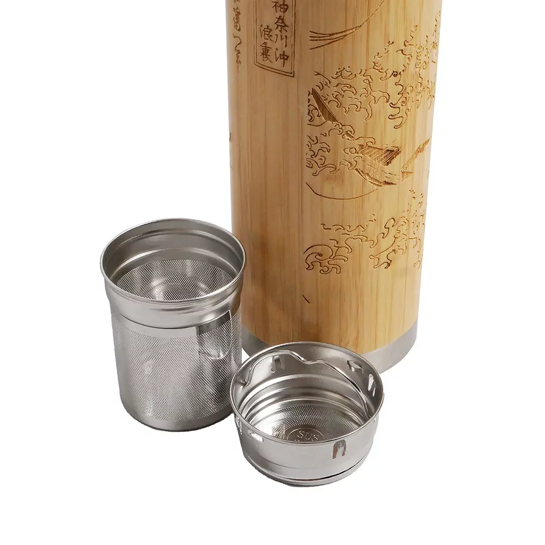 Elegantní bambusová láhev s jemně vyrytým motivem slavného díla The Great Wave off Kanagawa od Hokusaiho je ideální pro milovníky čaje i umění.