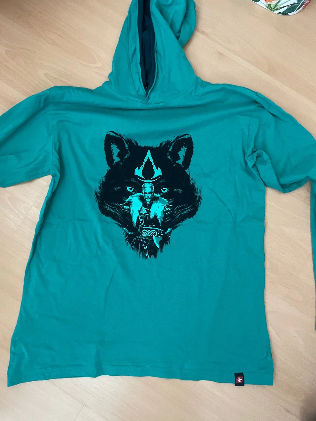Tyrkysové tričko s kapucí a potiskem vlka ze hry Assassin's Creed: Valhalla - pro všechny fanoušky série či příznivce severského stylu.