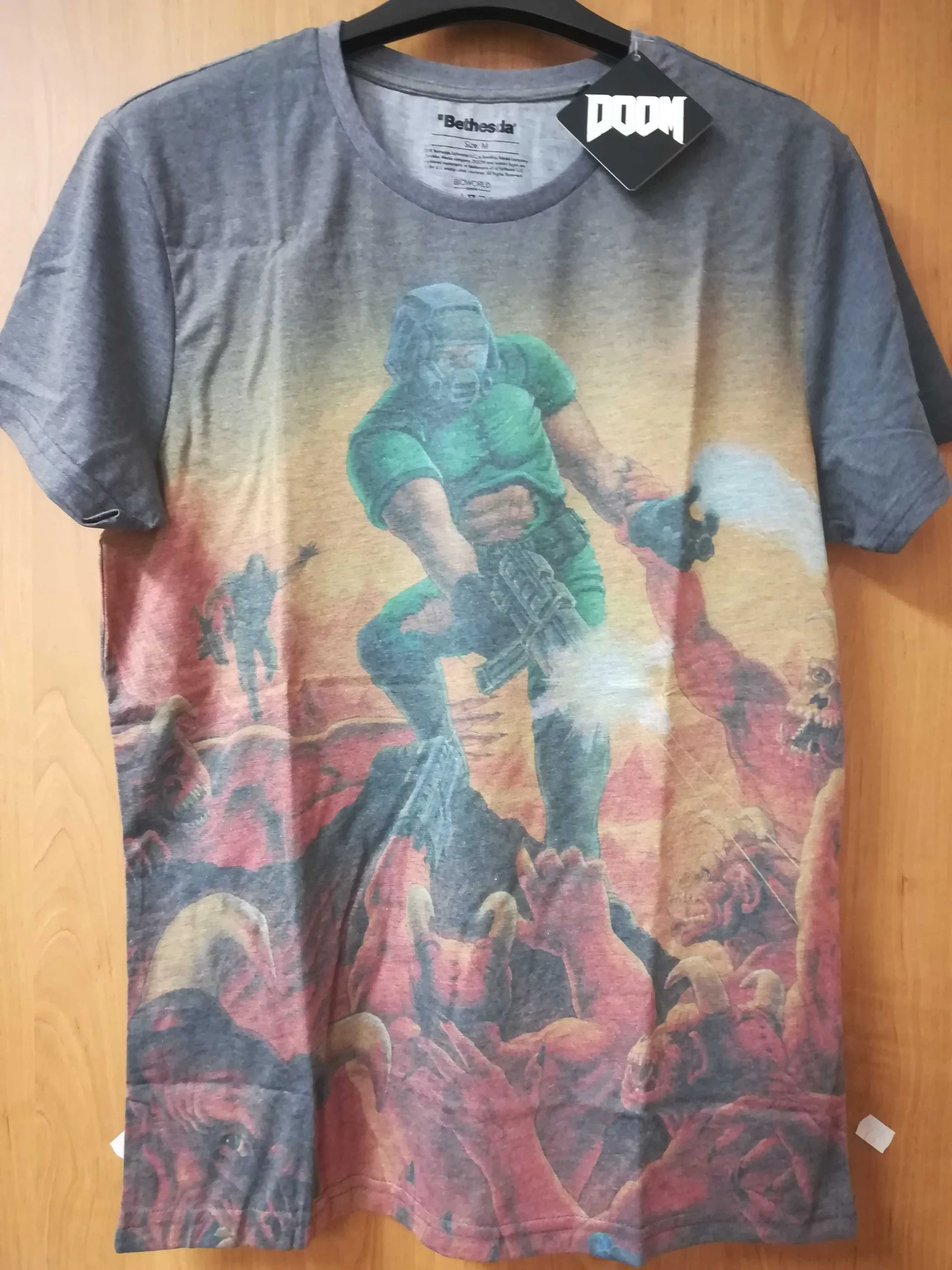 Krásné celopotiskové tričko (potištěné stejným motivem z obou stran) s klasickým obrázkem z původního Doomu, legendární střílečky společnosti id Software.