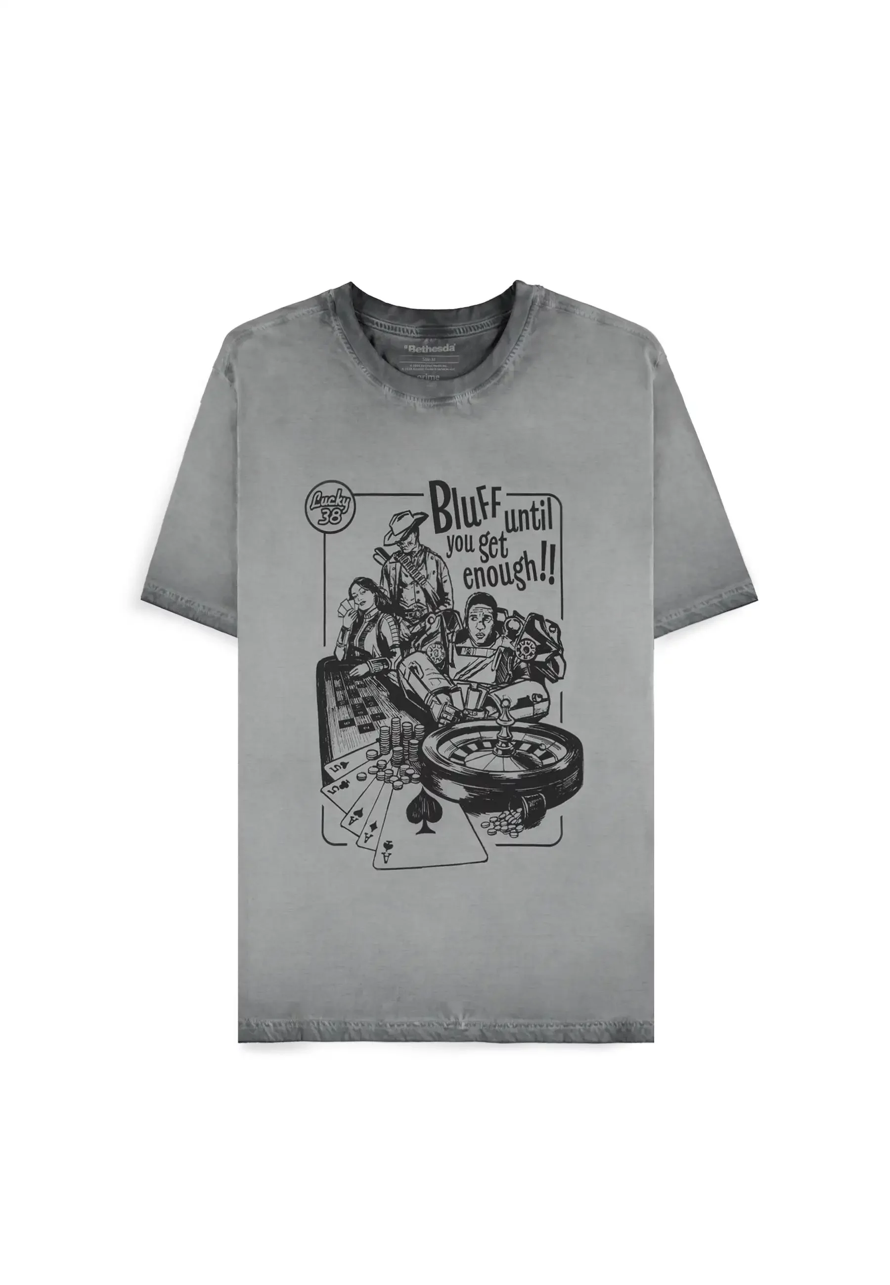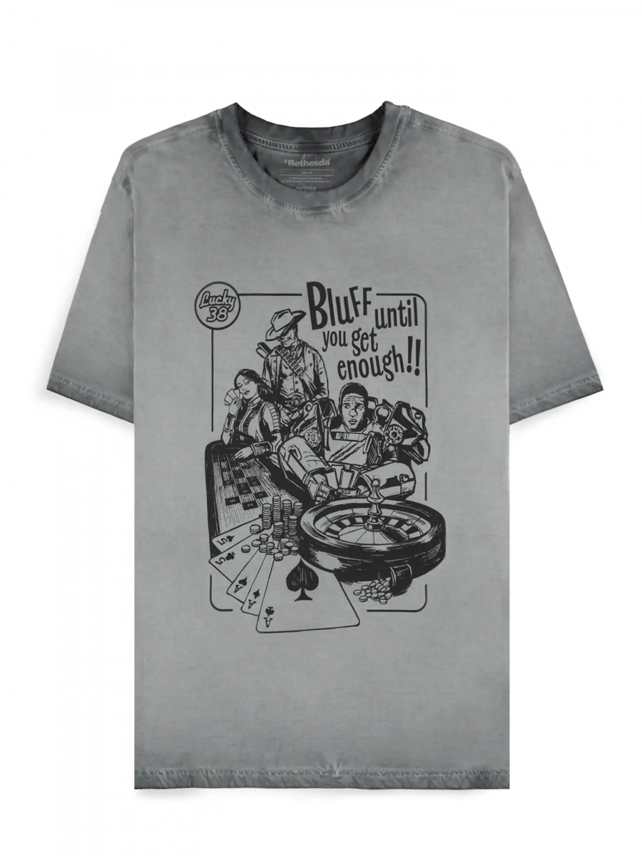 Stylové tričko s retro ilustrací, která dokonale vystihuje hazard, odvahu a drzost pustiny. Motiv inspirovaný světem Falloutu kombinuje karetní hru, žetony a ikonické postavy v duchu starých plakátů, kde platí jediné pravidlo, blafuj, dokud to projde.