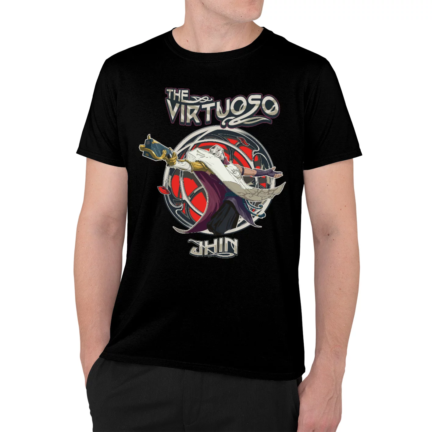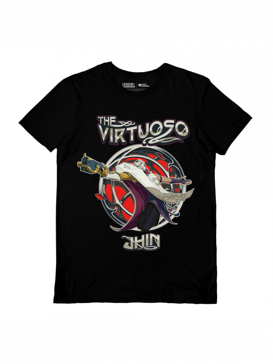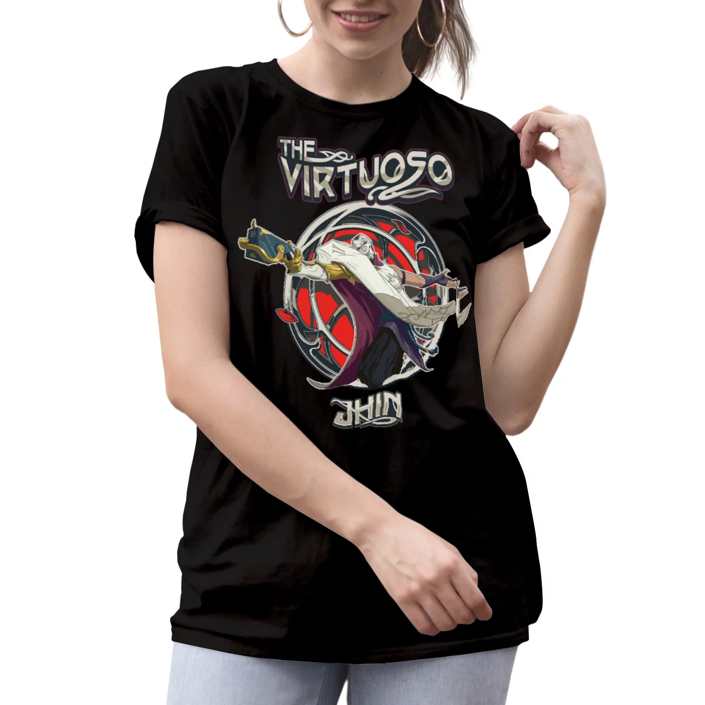 Umění, elegance a smrt v jediném výstřelu – přesně takový je Jhin, The Virtuoso. Toto tričko z League of Legends zachycuje jeho ikonický styl v dechberoucím designu.