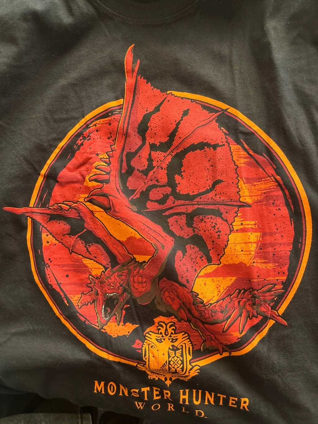 Krásné černé tričko pro všechny lovce ze hry Monster Hunter World s křičícím Rathalosem.