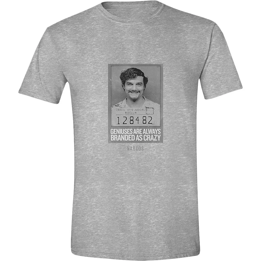 Šedé tričko s černobílým snímkem Pabla Escobara, kterého v seriálu Narcos společnosti Netflix ztvárnil herec Wagner Moura, při jeho prvním zatčení za pašování. Tento legendární snímek překazil Pablo Escobarovi jeho politickou kariéru.