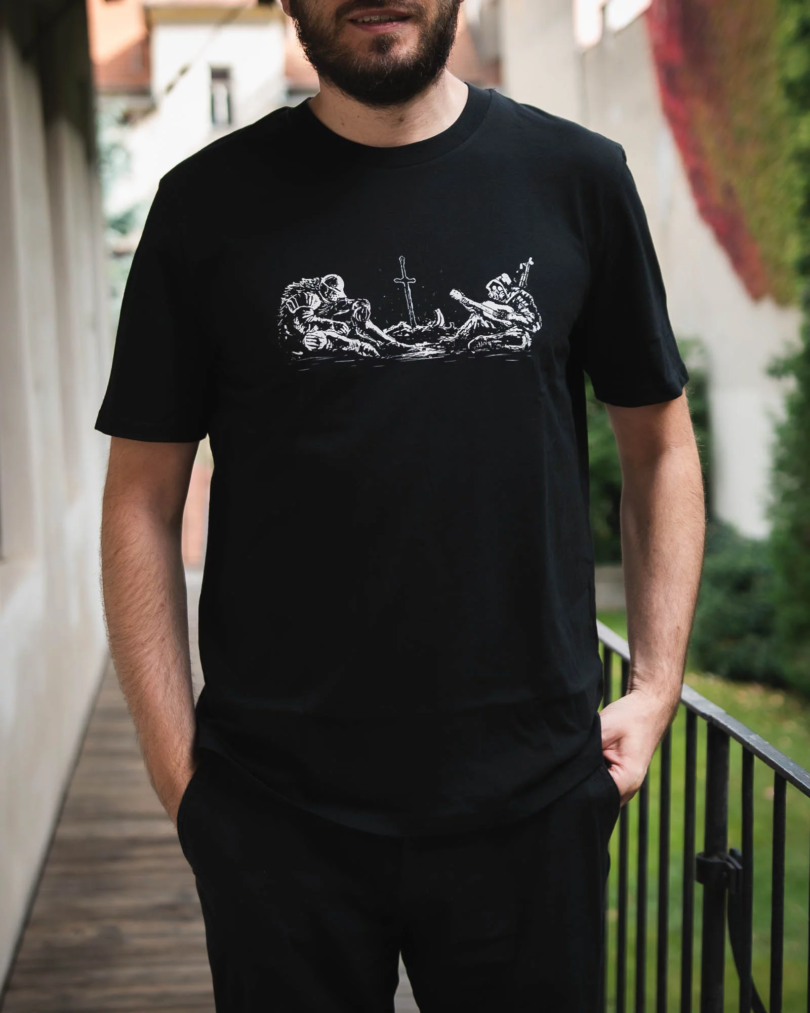 Těžko říct, o čem si tito dva poutníci povídají. Možná si stalker jen tiše drnká po výpravě Zónou a rytíř sbírá síly u ohně před dalším smrtícím soubojem. Každý, kdo hrál STALKERa nebo Dark Souls, tenhle moment dobře zná.