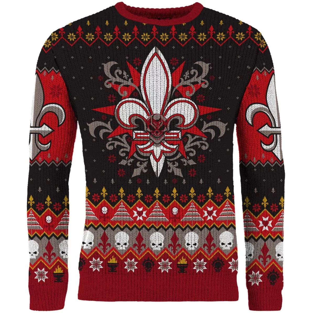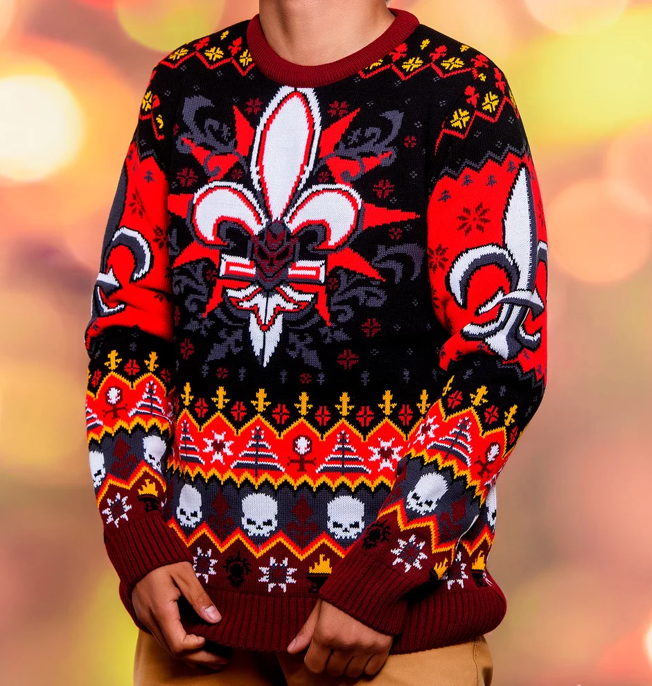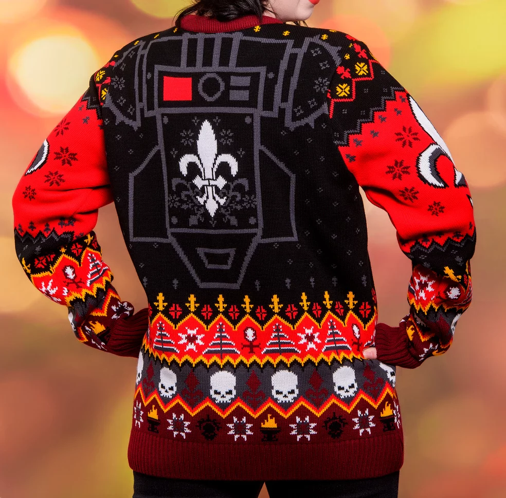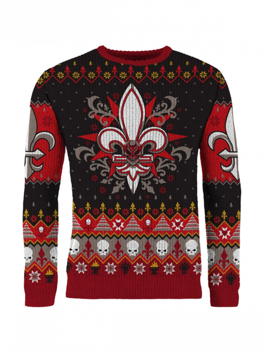 Vánoční svetr v barvách a symbolech Sisters of Battle potěší každého fanouška Warhammer 40,000. Výrazný motiv lilie doplněný lebkami a svátečními vzory spojuje temnotu grimdarku s vánoční pohodou.