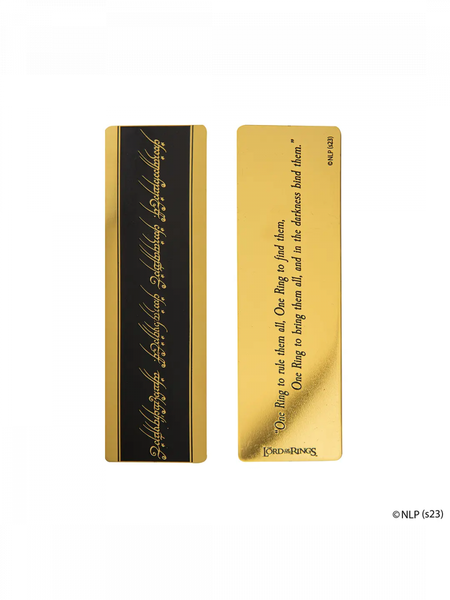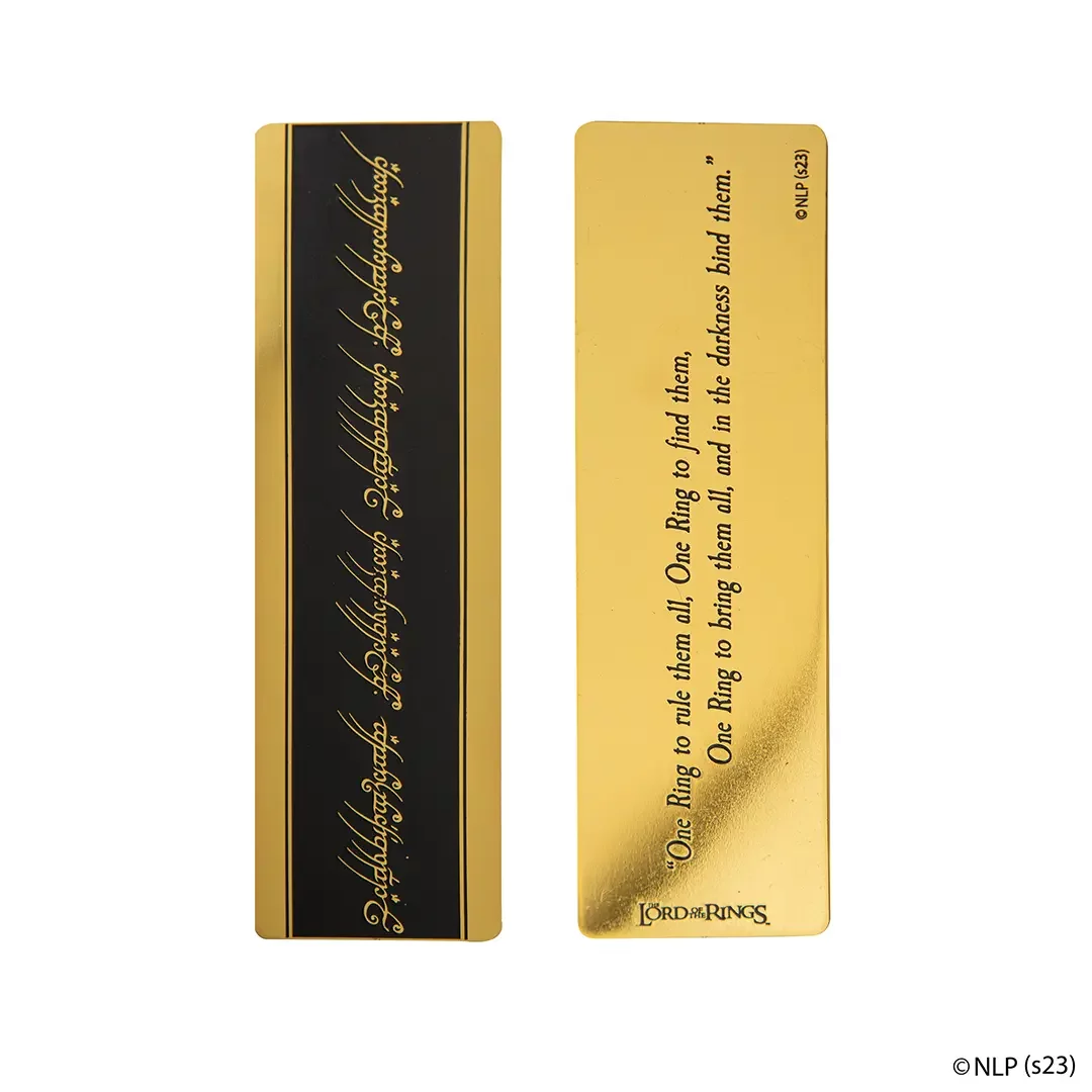Elegantní kovová záložka inspirovaná Pánem prstenů, zdobená ikonickým nápisem Jednoho prstenu v černé řeči.