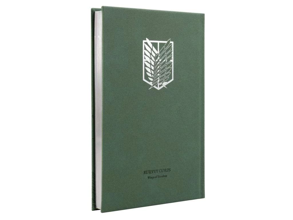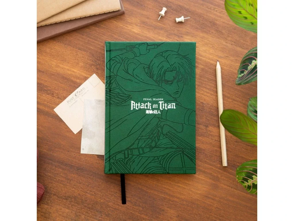 Elegantní zápisník inspirovaný anime Attack on Titan potěší každého člena Survey Corps! Stylový zelený obal zdobí motiv z finální série a emblém Wings of Freedom, symbol odvahy a svobody.