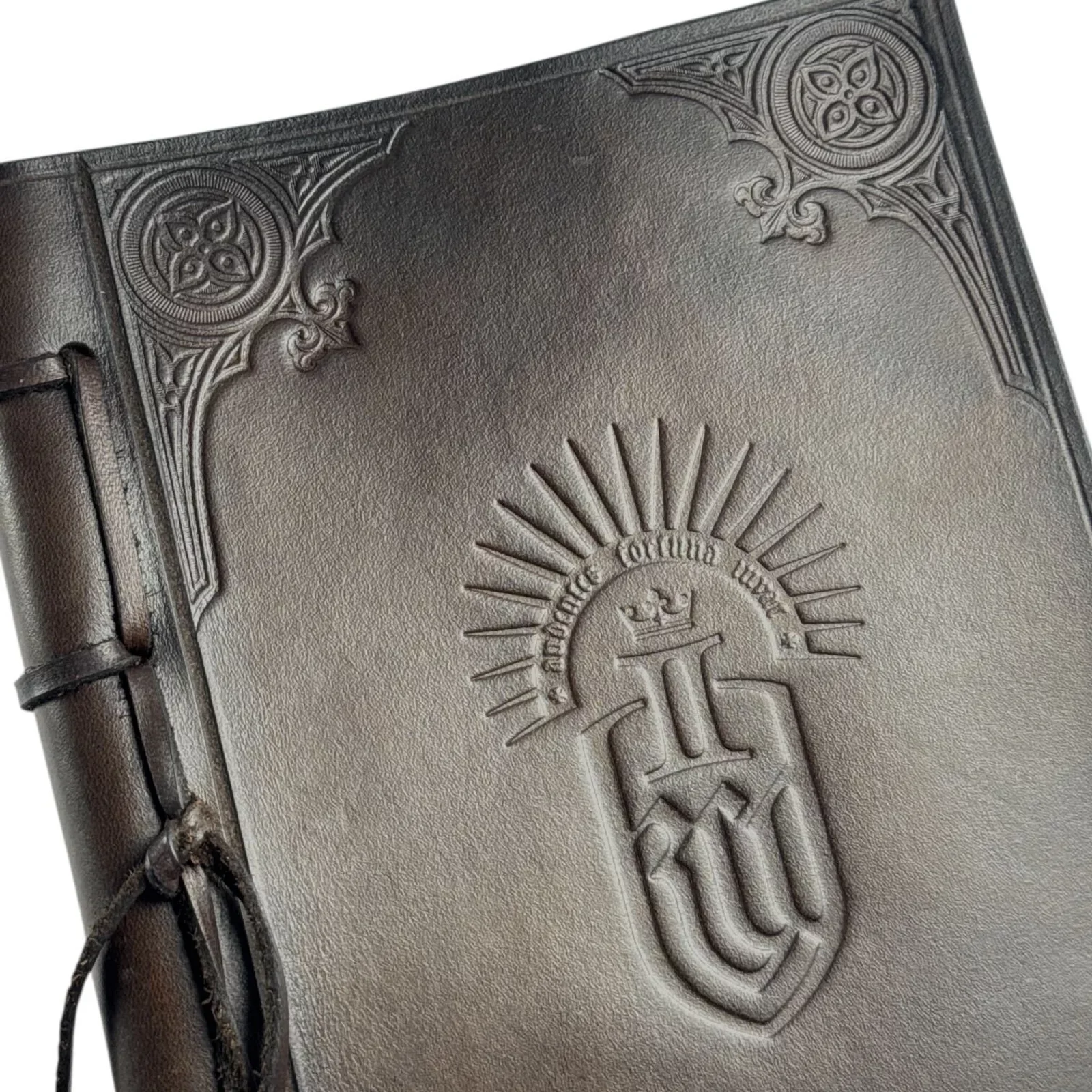 Zápisník s ručně vyráběným zdobeným koženým přebalem s vyraženým logem hry Kingdom Come: Deliverance II. Rohy kožené desky zdobí motivy ze zachráněných starých raznic, které po více než sto letech znovu našly uplatnění a nyní se vracejí k životu.